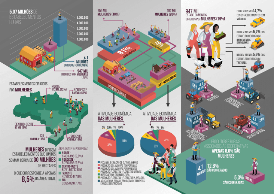 Data: 16/03/2020 Mapa, Embrapa e IBGE apresentam os dados sobre mulheres rurais MAPA, EMBRAPA e IBGE acabam de lançar publicação especial do Censo Agropecuário 2017, com recorte de dados sobre as mulheres rurais. A publicação mostra que apenas 19% dos estabelecimentos rurais são dirigidos por mulheres, e 21%  têm um casal em codireção (). Há diferenças entre as regiões no país, e regiões com maior vulnerabilidade socioambiental têm maior proporção de mulheres na direção. A desigualdade de gênero na direção dos estabelecimentos  se estende em diversos outros aspectos da Censo....